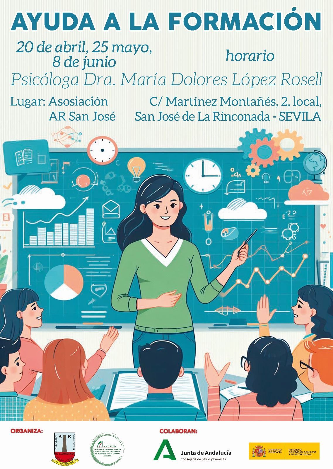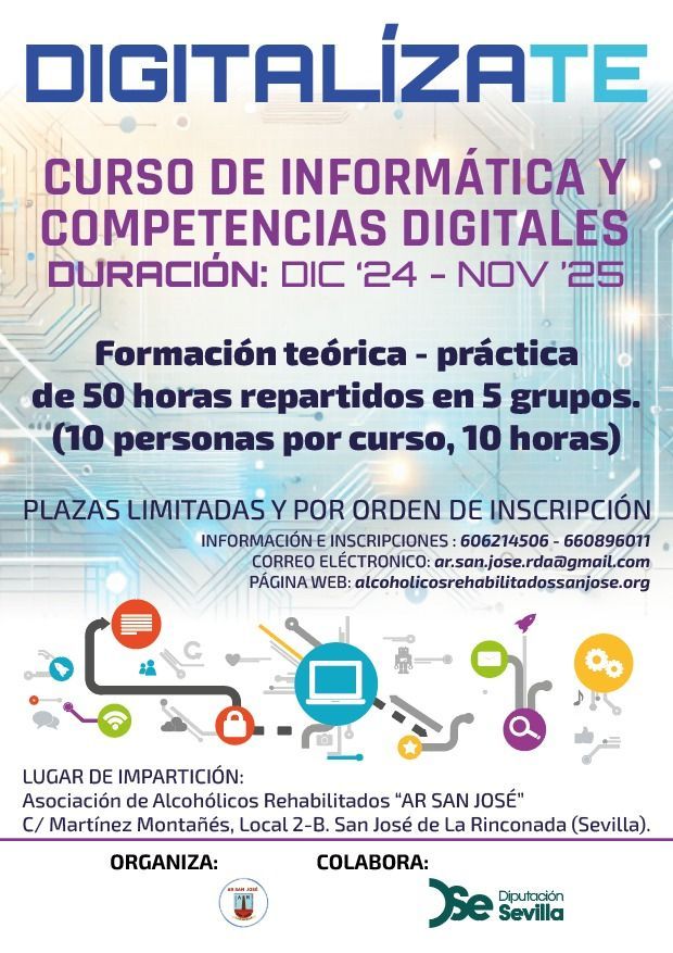 La Diputación de Sevilla, concede una subvención a la Asociación de Alcohólicos Rehabilitados San José de la Rinconada, para realizar un curso gratuito de informática y competencias digitales, el cual esta diseñado para que presencialmente 50 personas de la provincia de Sevilla se beneficien, los curso se impartirán en la sede de esta Asociación, en 5 grupos de 10 personas por riguroso orden de inscripción.
